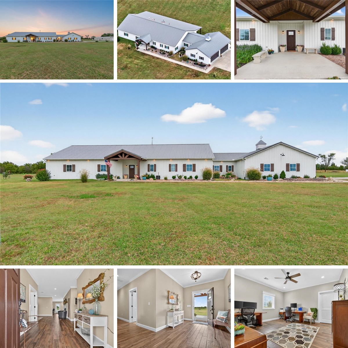 Sprawling Custom Home on 22 Acres with Shop & Guest Quarters. Welcome to this stunning custom-built home offering well-designed living space on a beautifully maintained 22-acre property. Perfectly blending luxury, functionality, and country living, this home features 2 spacious living areas connected by a cozy double-sided fireplace, all finished in elegant wood-grain porcelain tile and ceramic flooring throughout. Inside, you'll find 3 bedrooms, 2.5 bathrooms, and a large media/game room that could easily serve as a 4th bedroom. The oversized mudroom and separate utility room with a built-in sink provide ample storage and convenience. The home boasts an oversized kitchen, upgraded trim, custom cabinetry, and granite and quartz surfaces throughout, all finished in neutral, soothing tones that complement any decor. Enjoy the peace of mind that comes with a 4-car garage featuring an above-ground storm shelter, plus an additional underground shelter located in the shop area. The shop also includes fully equipped guest quarters with 2 bedrooms, a full bath with his-and-hers toilet rooms, pantry storage, and a combined living/kitchen/dining area with split air system, ideal for extended family, guests, or rental income.