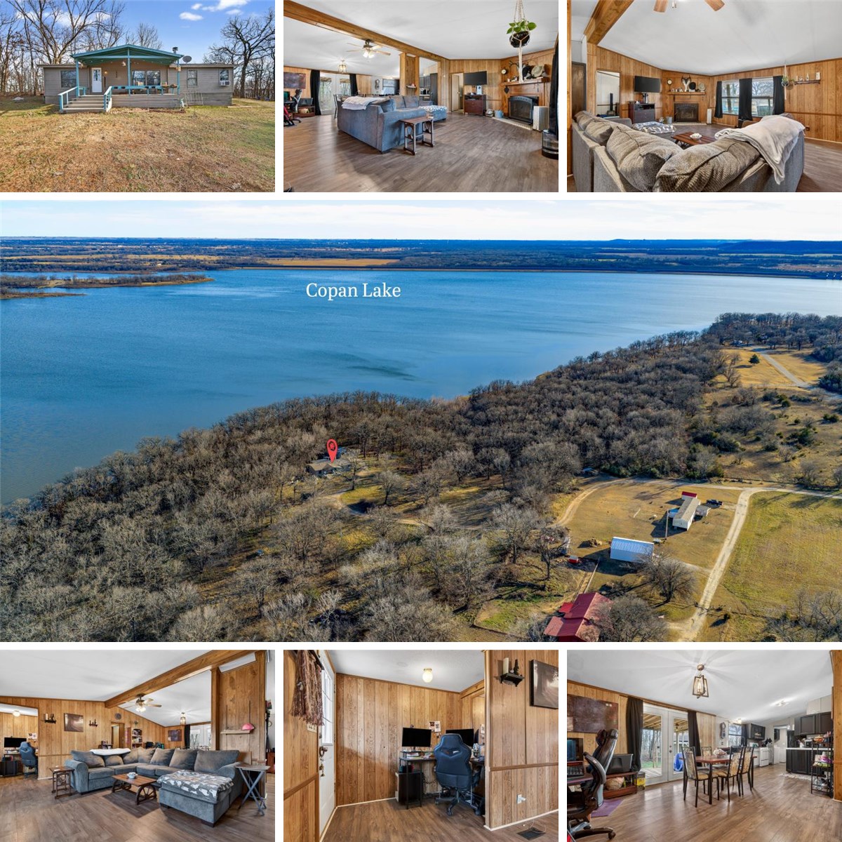 Nestled on 1.7 acres bordering Corps of Engineers land at Copan Lake, this factory-built home offers a rare blend of privacy, recreation, and everyday comfort. Located next to Post Oak Campground, the property provides direct access to a hiking trail leading straight to the lake, making it the perfect spot for swimming, fishing, and nearby hunting access—all right from your backyard. Inside, you’ll love the open floor plan with a split bedroom design, enhanced by vaulted ceilings, new wood-look laminate flooring, and a cozy wood-burning fireplace. The kitchen features newer cabinetry, two pantries, and a gas stove, offering plenty of storage and functionality. The large primary bedroom includes a private half bath already plumbed for a future shower or tub, while the hall bath offers a tub/shower combination. A spacious laundry room provides room for a freezer or extra refrigerator. Enjoy quiet mornings or evening sunsets on the 22x8 covered front porch, and take advantage of the 10x16 shop with electric, 24x24 carport, and peace of mind with a new roof (2022) and new furnace (2018). If you’re looking for a lake-area retreat with room to roam and endless outdoor enjoyment, this property is truly something special.